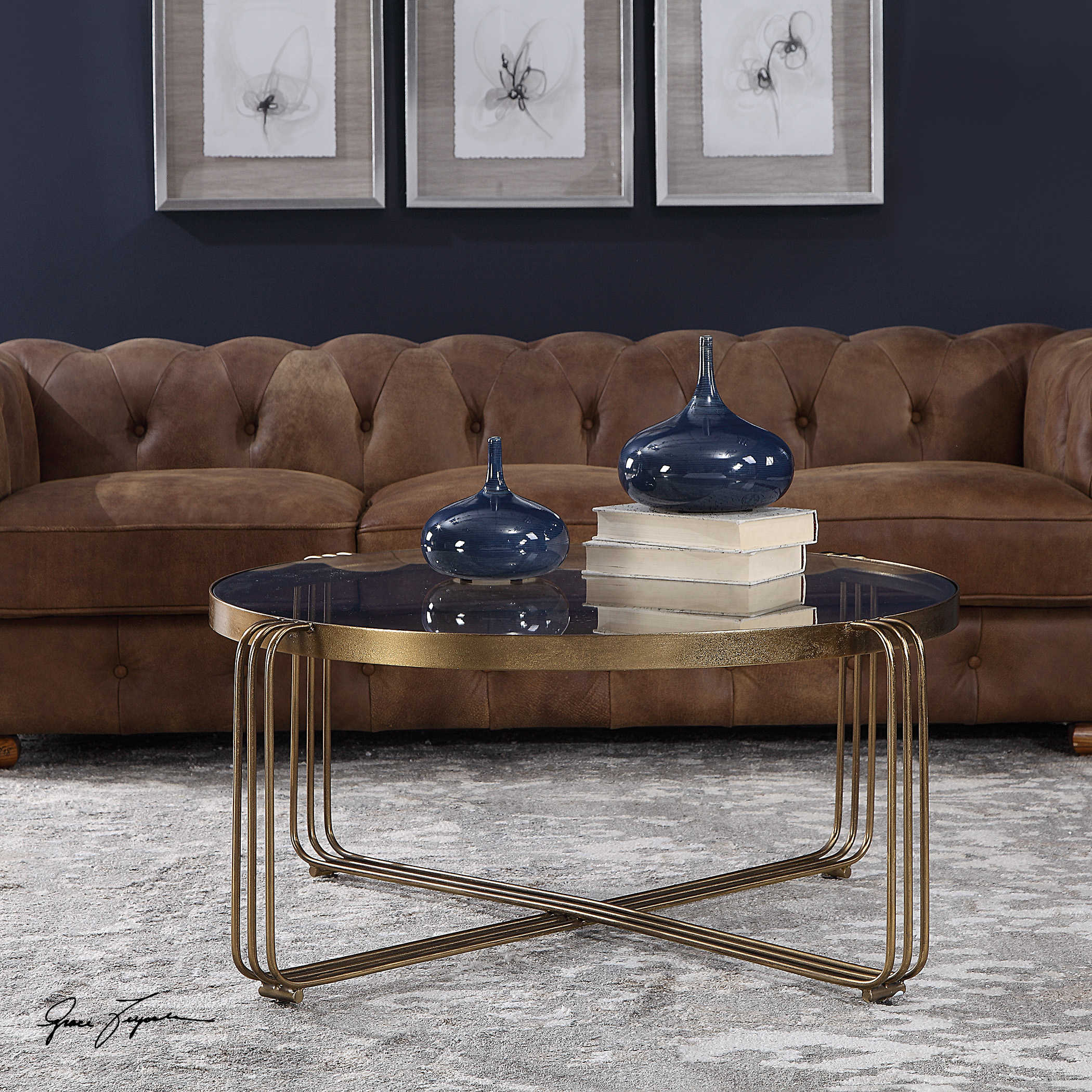 • Solidly constructed from hand forged iron, this coffee table shows off clean lines in an antique gold finish with a clear tempered glass top.
