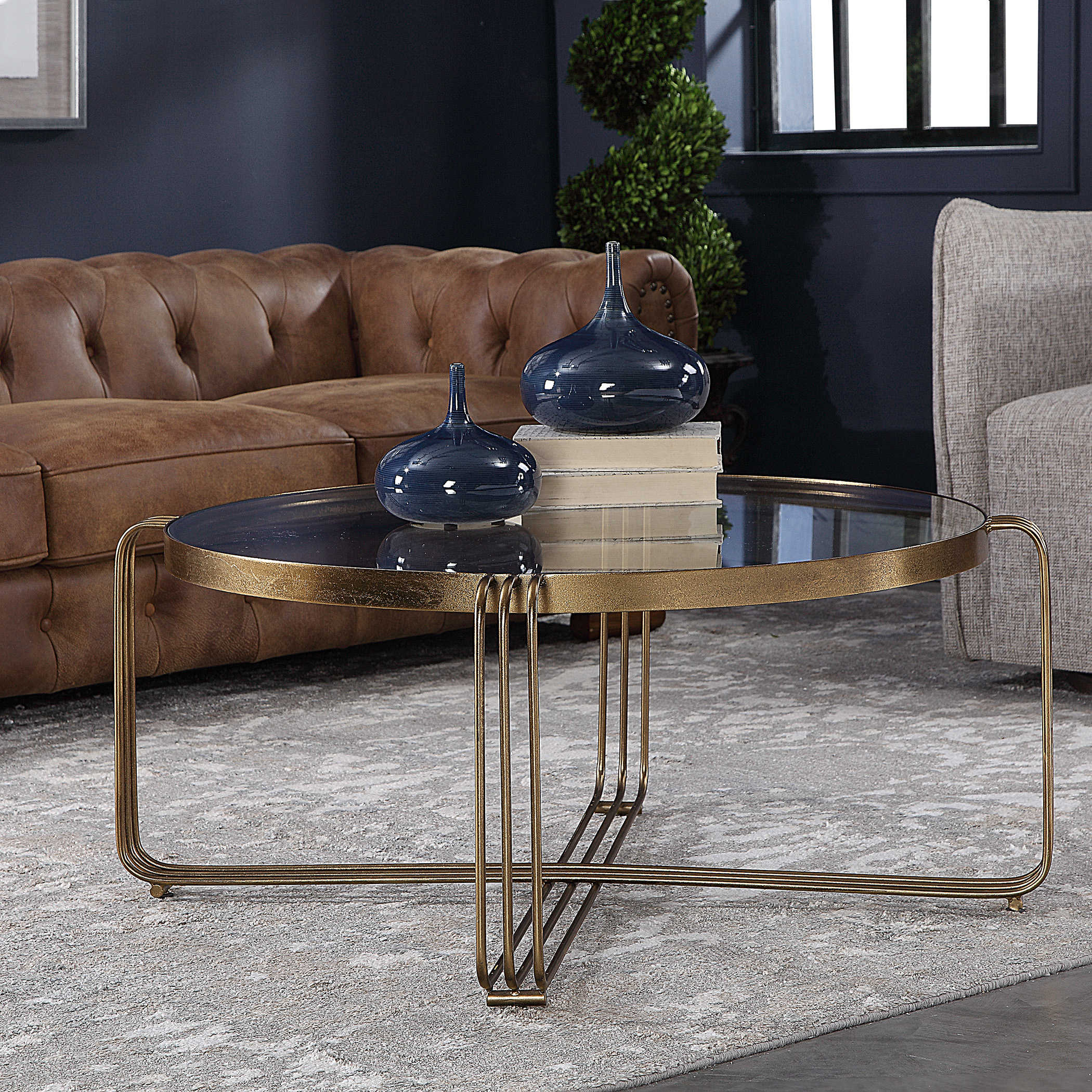 Solidly constructed from hand forged iron, this coffee table shows off clean lines in an antique gold finish with a clear tempered glass top.
