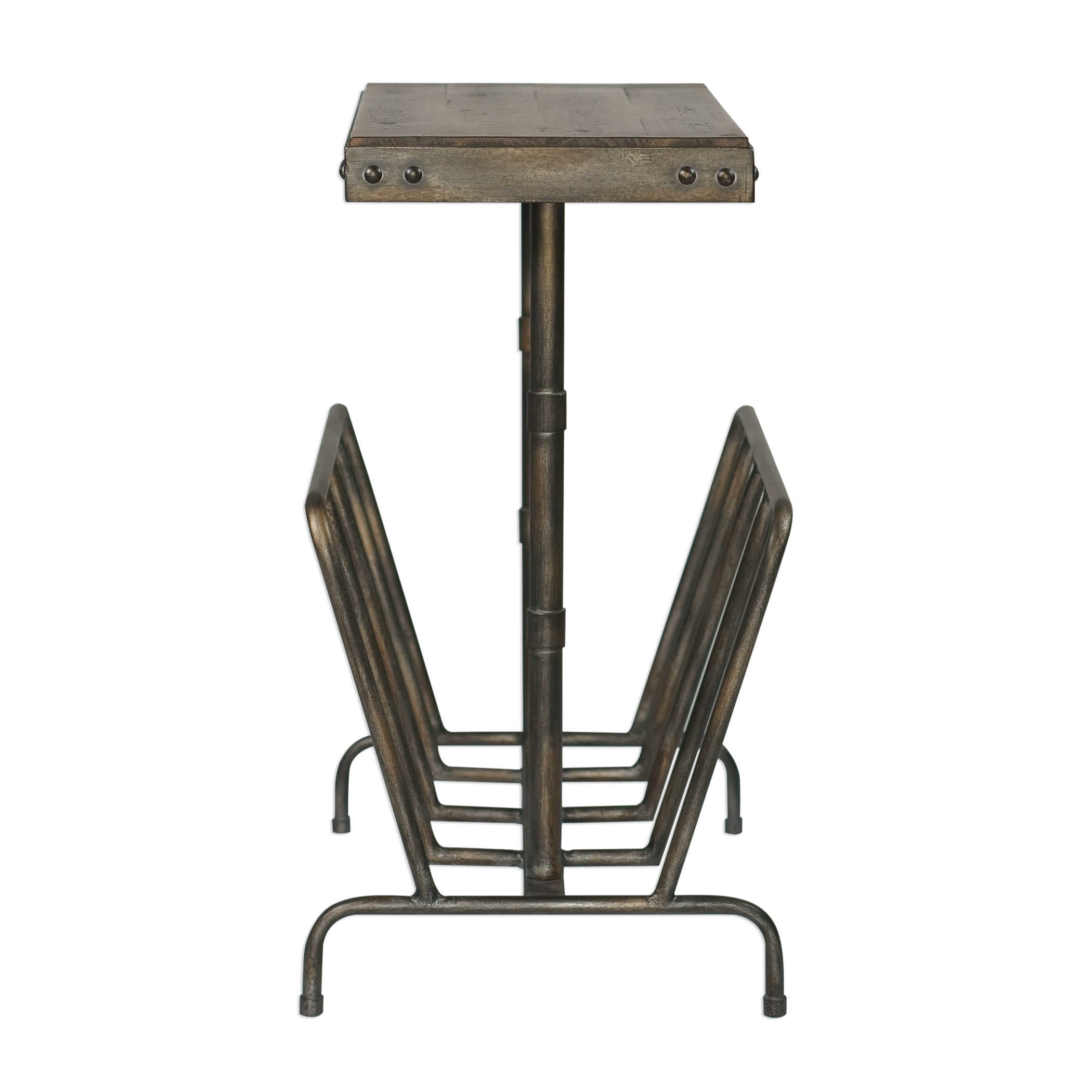 This functional side table features a convenient magazine rack with an industrial iron framework finished in a lightly burnished brushed iron with rivet accented corners. Top is solid acacia wood finished in a distressed warm walnut stain.