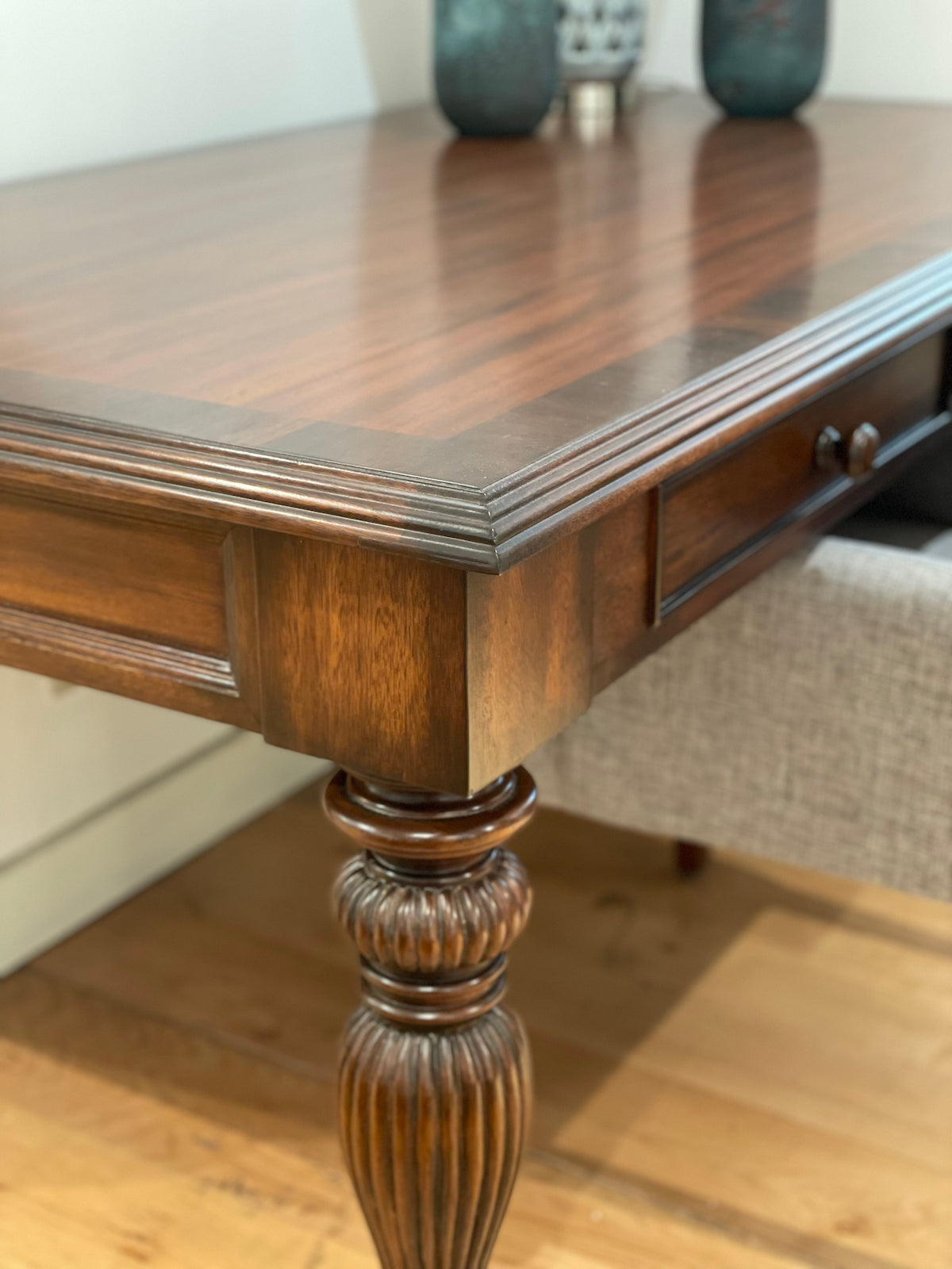 This classical style writing desk features an elegant turned and fluted legs. Its spacious workspace is crafted in dual-tone veneer wood top as well as 2 drawer compartment for storage.