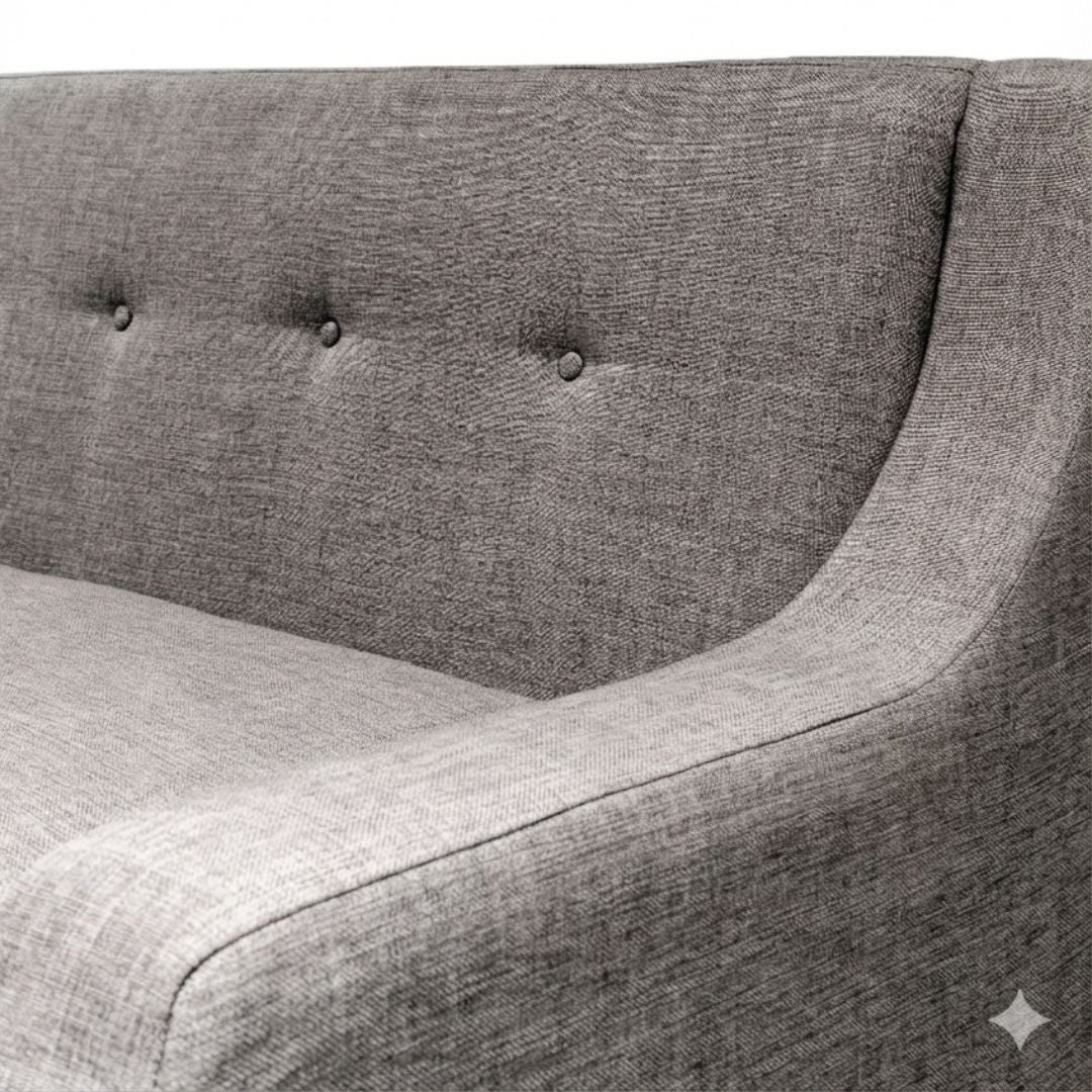 Solid wood base upholstered in fabric with decorative buttons on back rest