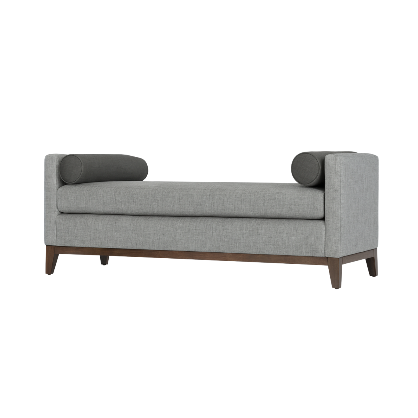 • A simple long bench with removable upholstered seat finished in fabric meant for long corridors, foyers or the edge of  beds.