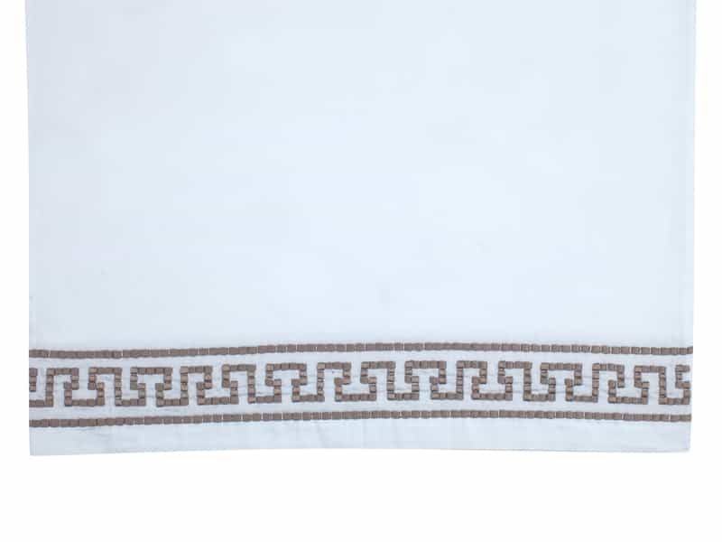 The Dimitri Queen Sheet Set (Q Set) is made of White 100% Long Staple Egyptian Cotton Sateen 300 Thread Count with a Dk. Champagne Tile Embroidery on the Flat Sheet and the Pillowcases.