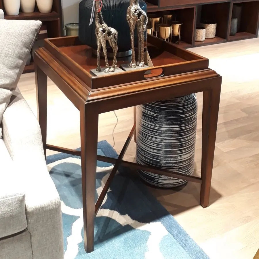 Creating a nice display space for accent pieces, a nice lamp and you're favorite books on top of this tray-top end table is its great function.