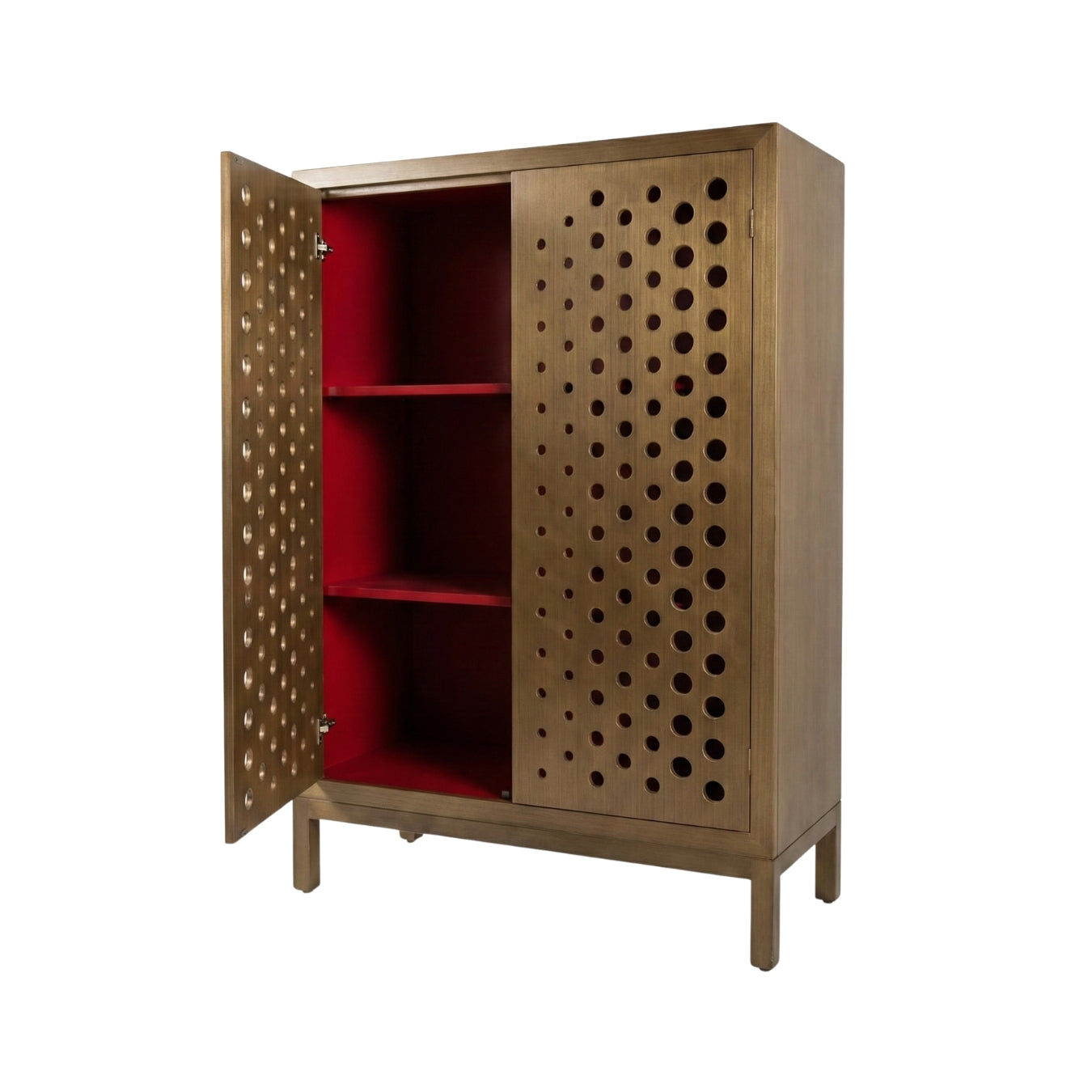 The Riley Cabinet is part of Mejore’s second collaboration with design Duo Rita Nazareno and Gabriel Lichauco who took inspiration from the Op Art movement of the 1960s for the main design elements in the collection. The OpArt mini collection features the the circle pattern in a somewhat familiar optical illusion pattern reminiscent of the works of artists such as Bridget Riley and Victor Vasarely. A hint of pop-up color is seen through the openings of the circle patterns giving a playful twist to the furniture.