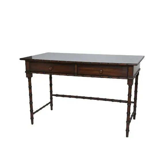 This sleek writing desk features a bamboo style carved molding and legs, creating a laid back classic eclectic charm. Its wood top is spacious to hold a desktop or laptop, and it's 2-drawer compartment is a great storage to hide away excess clutter.