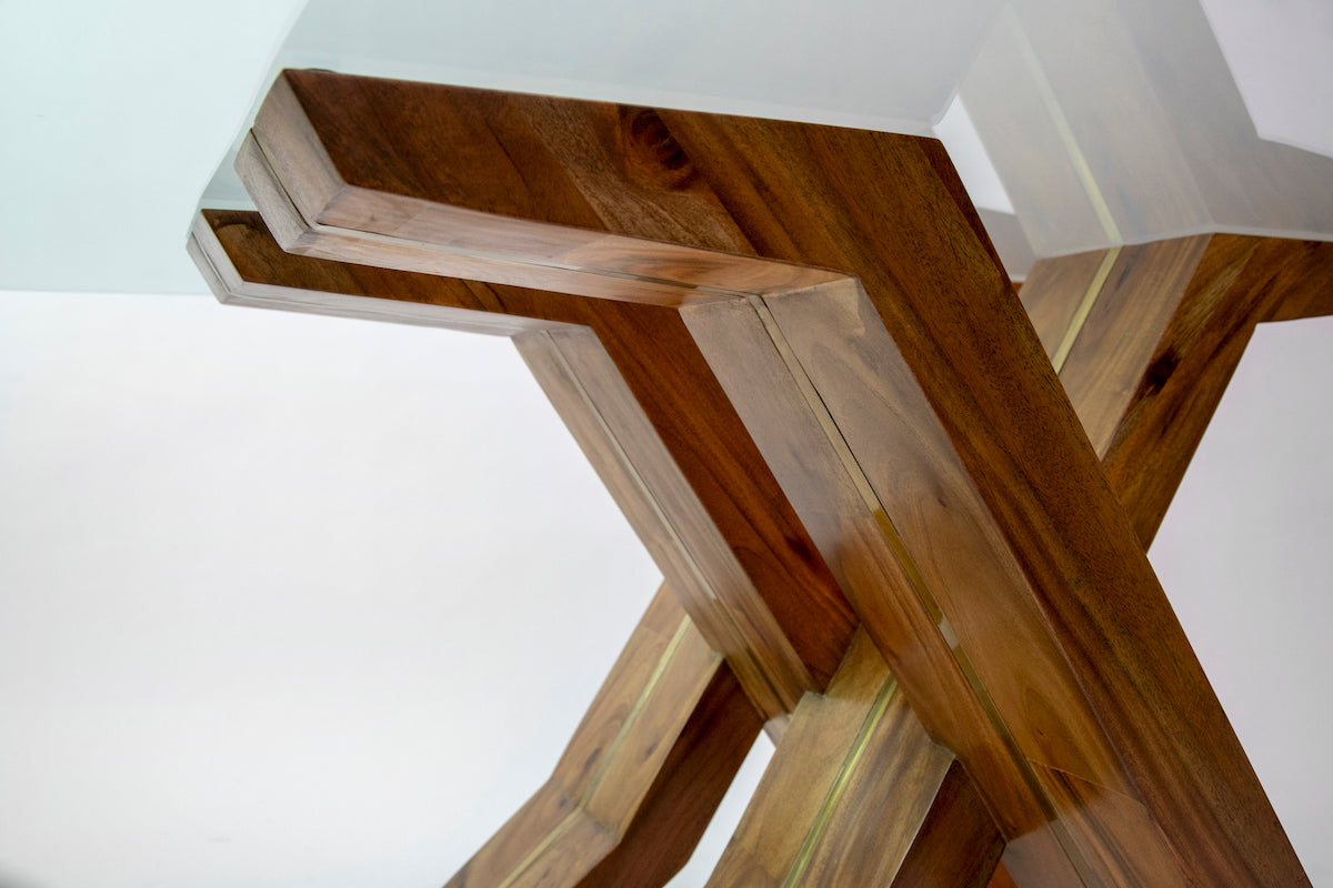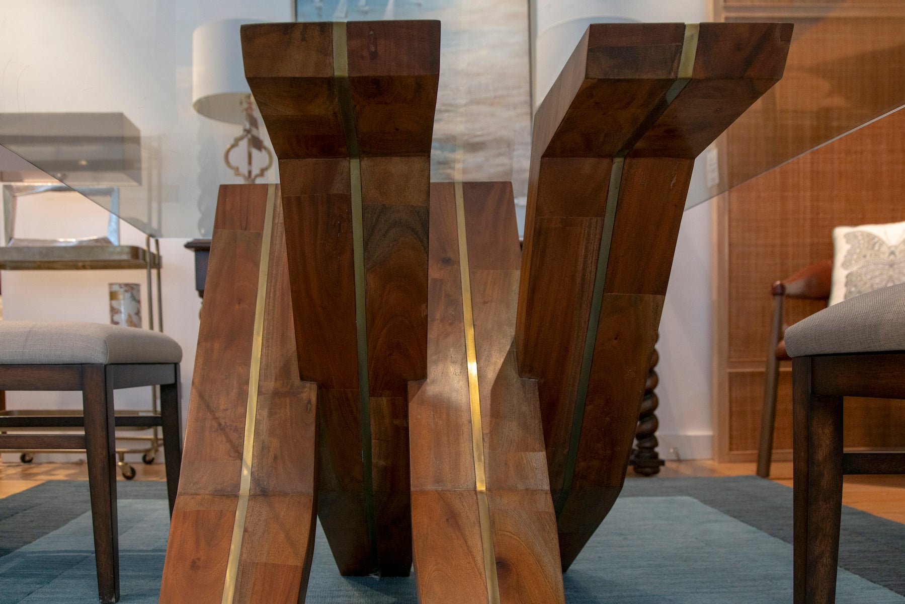 A dramatic blend of glass, metal and wood, the Theodore Dining Table is a modern 6-seater dining table. This piece is a perfect blend of masculine style and luxury in a modern piece.