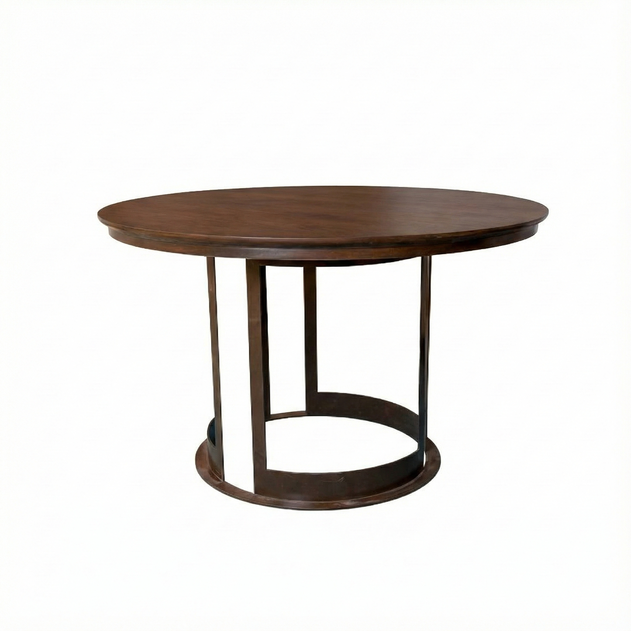 A uniquely shaped metal base and a wood veneered top makes it a good contrast for a modern contemporary style dining table that features its sleek charm and durability.